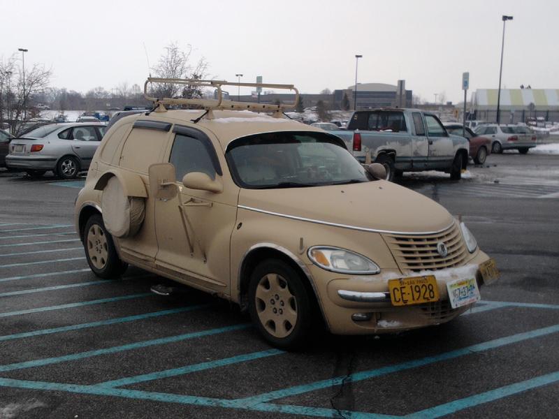 Here's a good one, Dodge Neon, the tuner car of choice for total idiots, those would be Integra or Tiberion headlamps hobbled into the front, primer, fart cannon and Neon green paint. And of course take a wild guess where I saw it, that's right Walmart