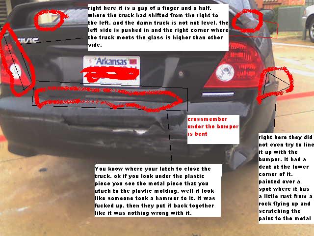 Ok I took my car to progressive cause the other company insurance did not want to pay for the policyholder's fu<k up. So progressive said just bring it up to us and we'll fix it don't worry. Okay! They put me in a 06 Jetta RS for about a month now. Yesterday my girl goes up to return the car for the vic. RIGHT! WRONG!!!!!!!!!!! She gets up there and sees that the damn truck still has a gap in between the light taillight and trunk. So she tells them that this is not fixed right. She leaves it there and they call me back today to come and get the car. Ok the second time we go up there. Now before I get there they're trying to get her to take the car and go. Before I get there. Now when I get there I look over the car and see.