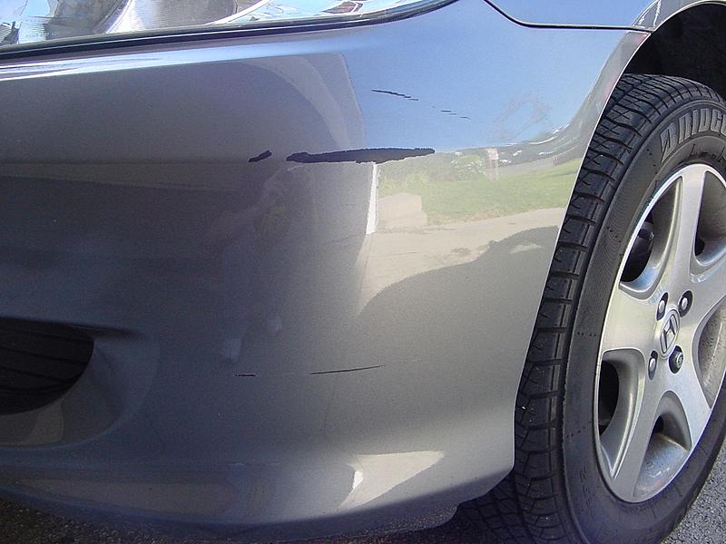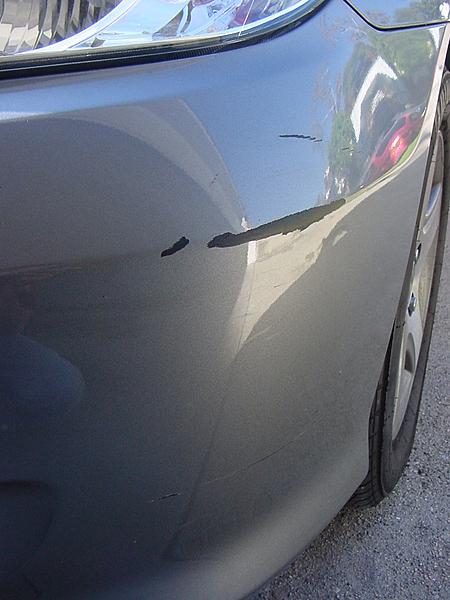 So idiot, scratched up my bumper and did not even leave a note. This happened at the parking lot of my school yesterday. Parked my car and when I came back after classes, I found that the driver's side of my front bumper got paint scratched off really bad. No dents though. I do not remember the car that parked next to me, but I actually went around the lot this morning looking for a car with magneisum paint on its left side bumper...no luck yet...