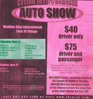 Fees include admission to Sahlen's Sports Car Grand Prix, corral parking, parade lap, entry into judged auto show and a free T-shirt.