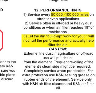 Also, doesn't it recommend cleaning only after every 100,000 km? I remember reading somewhere that if you clean more often than that, it actually hinders performance...like the dust buildup actually helps the filter or something? Could be wrong...