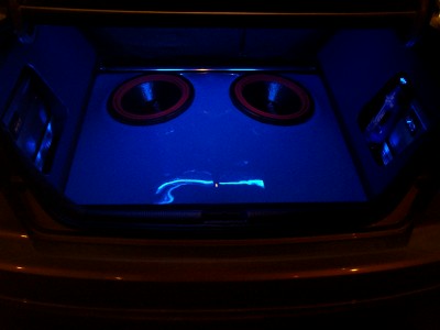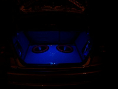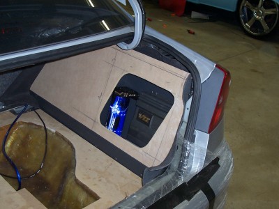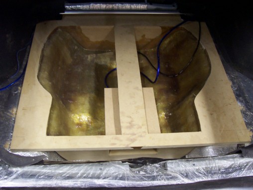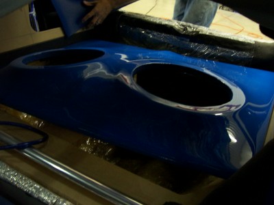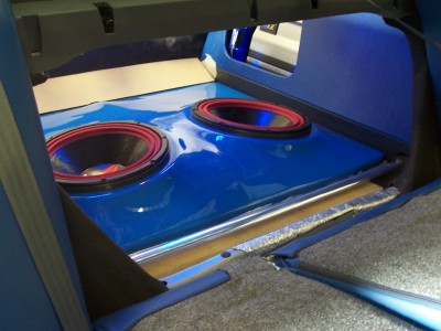 here are 2 pics of the floor painted in BMW M3 blue...it's not set right, it was just put in to get an idea...the subs will be on a bit of an angle facing left and right, down the middle there is a ridge (or spine) to seperate...you can see the break in the darker of the 2 pics....