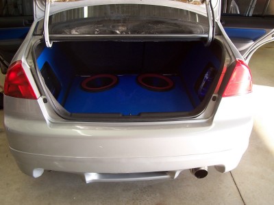 Well i got my car back today, still not completely done though, have to go back and finish up carpeting off the trunk lid and then later on to cover up the rear speaker deck. For importfest i'll have the carpet under the trunk lid...so here are pics of the setup, with a couple night pics. Man does it pound!!!!! And my components up front are great! Super clear and boy can they get loud with the amp. The beginning of the trunk is carpeted off...it's covering up the giant port...these subs move stupid amounts of air. Enjoy!!
