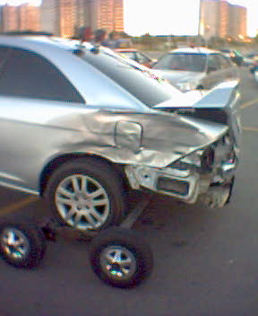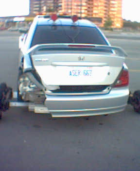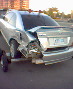 some idiot ran a red light and basically t boned a yukon, he was going at least 60kmh...so that yukon was in the middle lane going north and lucky me was beside him, so the yukon ended nailing me pretty bad and took off my whole back side....pretty bad, i have pics with my camera phone that i took but its really ugly...stupid ***** running red lighhts...the red light was at least 5 seconds long cause we were going north...