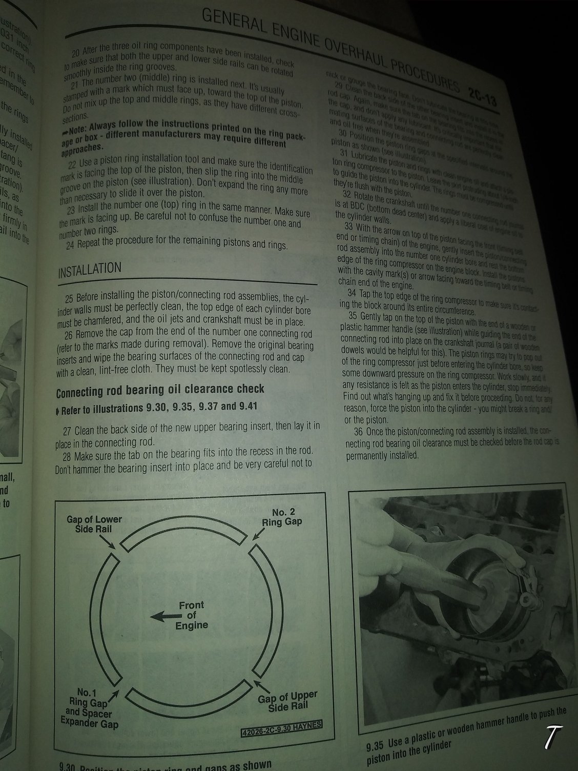 and i didn't know that i should put the rings down in the cylinder check the gap with the feeler gauge before i installed them. And one last thing, its the same feeler gauge that use to do valve adjustments is use to check the ring gap? I just want to do it right. And when i was doing the rings noticed a slight burn in about 2 of the rod bearings so i might just change those to.