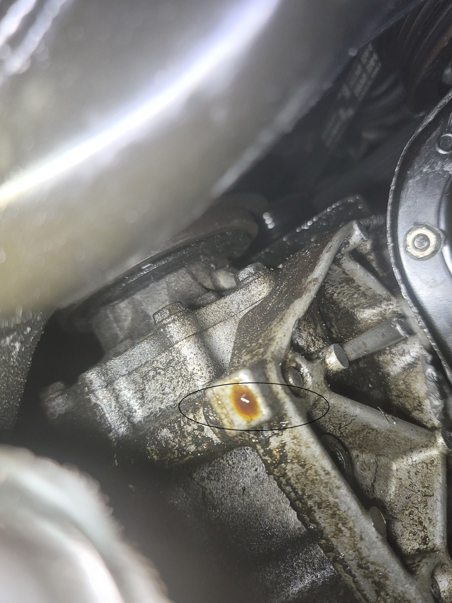 If it's the oil pump seal it would be leaking from the area circled in red in the below pic. It would then run down the block and look like an oil pan leak. You can clean this area really well then monitor. Some people put flour down to help pinpoint. You can see that area is a shinier color from the leaking oil, the oil pan gasket is also shiny with oil from the above leak.