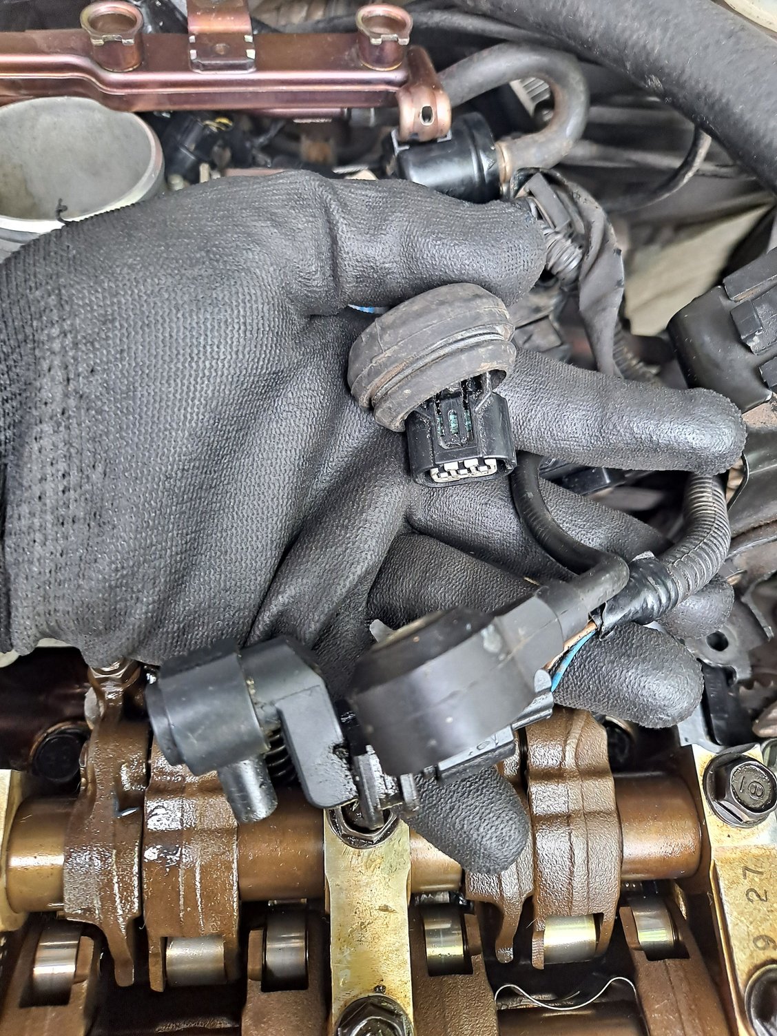 So, lucky for you, there's another dude's headgasket change thread that's active right now, and I've been using his pics to cross reference yours (particularly this post for that big chonky boy that' front/center in your sensor pic, but it looks like you got that bastard bolted in properly). The one that's between your thumb and index finger kinda makes me think that's possibly the TDC sensor, and the rubber grommet attaches to the outside of the upper timing belt cover. The one by your pinky (left most) kinda looks like the CKP sensor that should be down by the sprocket looking summabitch by the crank pulley, the rubber bit filling a square-ish hole and bolts to the block.