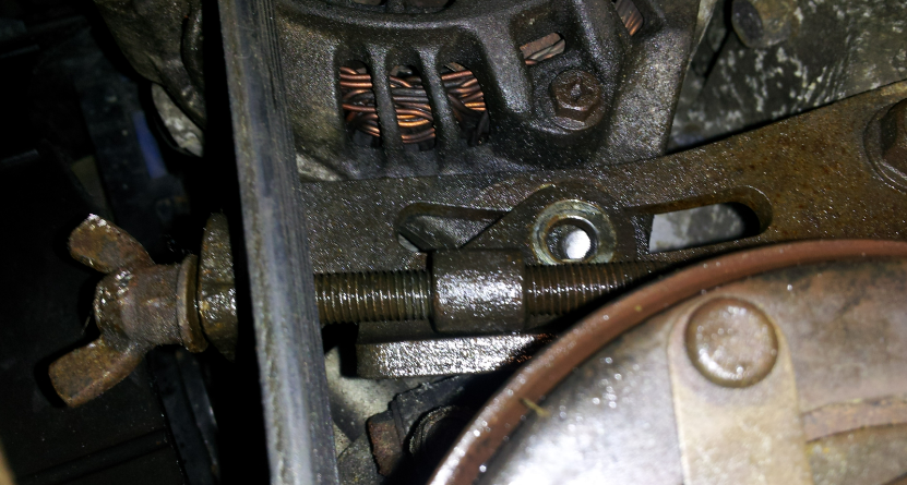 Funny enough, I was just looking at a thread I posted this pic in of the alternator adjustment. View is from the driver's side looking toward the block. It is missing a bolt in this pic, and that's the empty hole at the top
