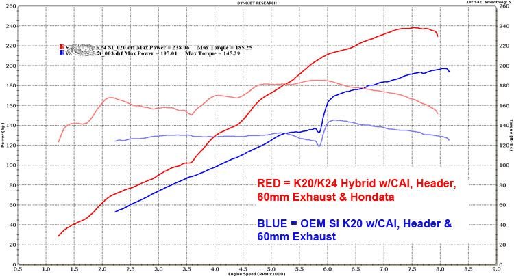Here's a dyno graph I found comparing a K20 and K24. Not a direct comparison because the K24 was tuned but you get the idea. In my opinion, there is no reason to use a K20 unless you want to rev to 8k+ with a stock engine.