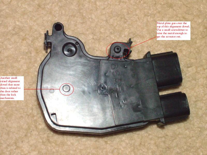 - In that last picture the cable going to the door lock in the door panel is out. You have to remove it from the lock mechanism on the metal bracket before you can remove the actuator.