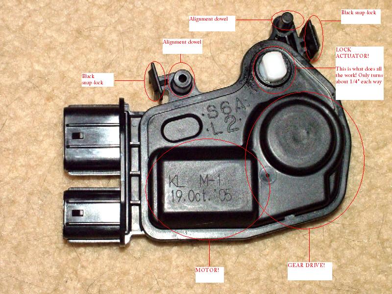 In looking at it I see what looks like two connection ports for the wires, what appears to be two tabs for possibly connecting to the lock assembly and the drive mechanism. This thing is pretty darn simple! Just a powered gear assembly with a plastic drive coupling on it. Oh.... maybe one screw goes into it too. I will go back now and look at the DIY and see if it makes sense. If it does then I will try to label the actuator the way I think it will go. I will tackle the one good actuator side (Left) tomorrow.