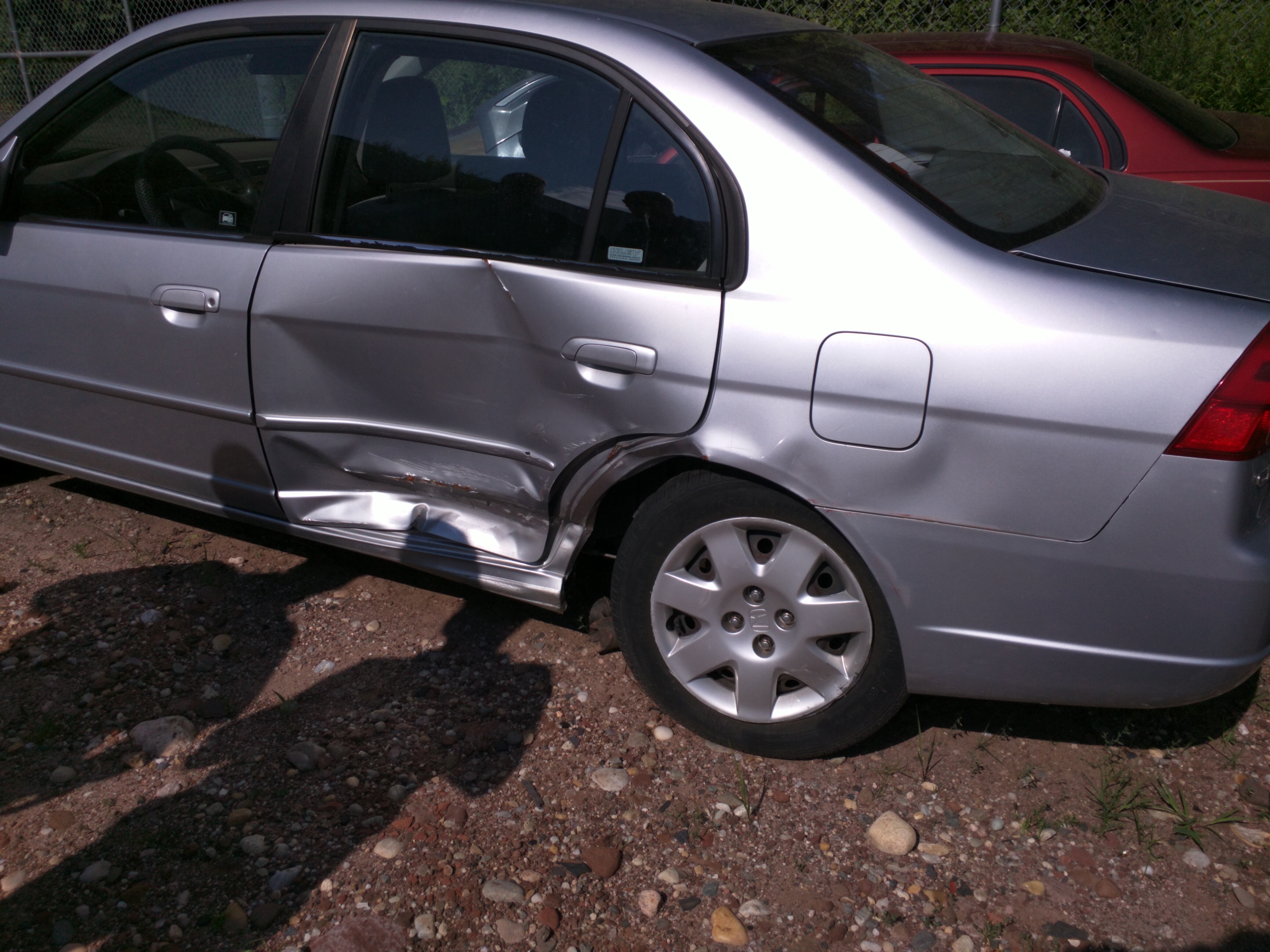 Hi guys Im new here and would like your guys assistance. Im looking at fixing a 2001 honda civic ex 4 door that was in an accident, my friend will give it to me for a couple hundred bucks. The person driving it was hit direct head on the drivers side rear door, while that happened the wheel was pushed towards the trunk. snapped the rod that goes through the bushing on the front part of the rear lower control arm, this caused the bolts that it mount to to bend and kind of messed up the metal around where the mount screw is, I want to know if i can fix that? I think the subframe is ok as it looked like wheel was just pushed backwards, the part of the lower control arm that connects to the subframe is slightly bent backwards, didnt look like it tweaked the subframe.Im going to attach some pictures. I know a bunch about car and have done some pretty serious work before and have a bunch of tools just no welder or air compressor. Im kind of looking to make this car driveable for around 800 bucks, so car cost is $200-$300.If this isnt feasable im looking at fixer uppers for around $800. The rest of the car is great, has around 100k miles and timing belt and whatnot was just done a week before the accident.