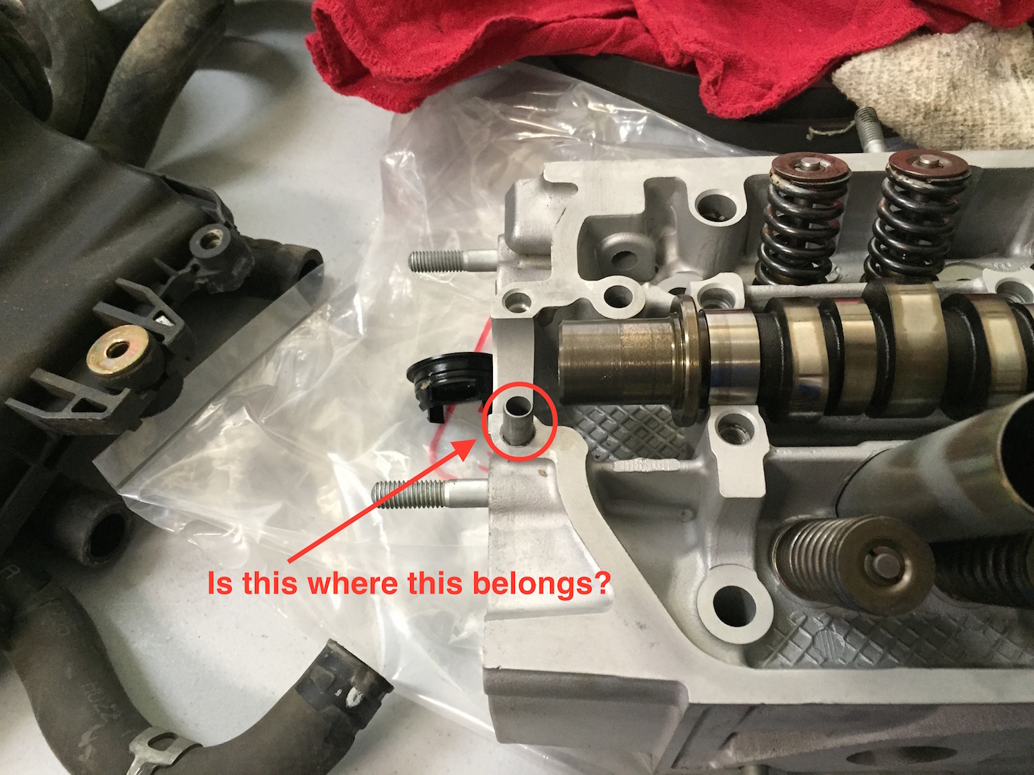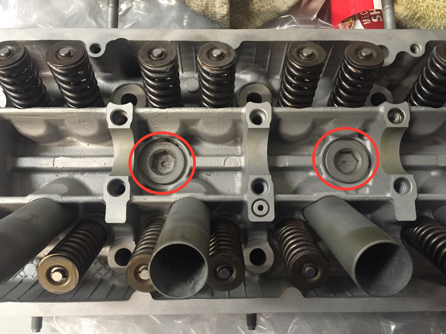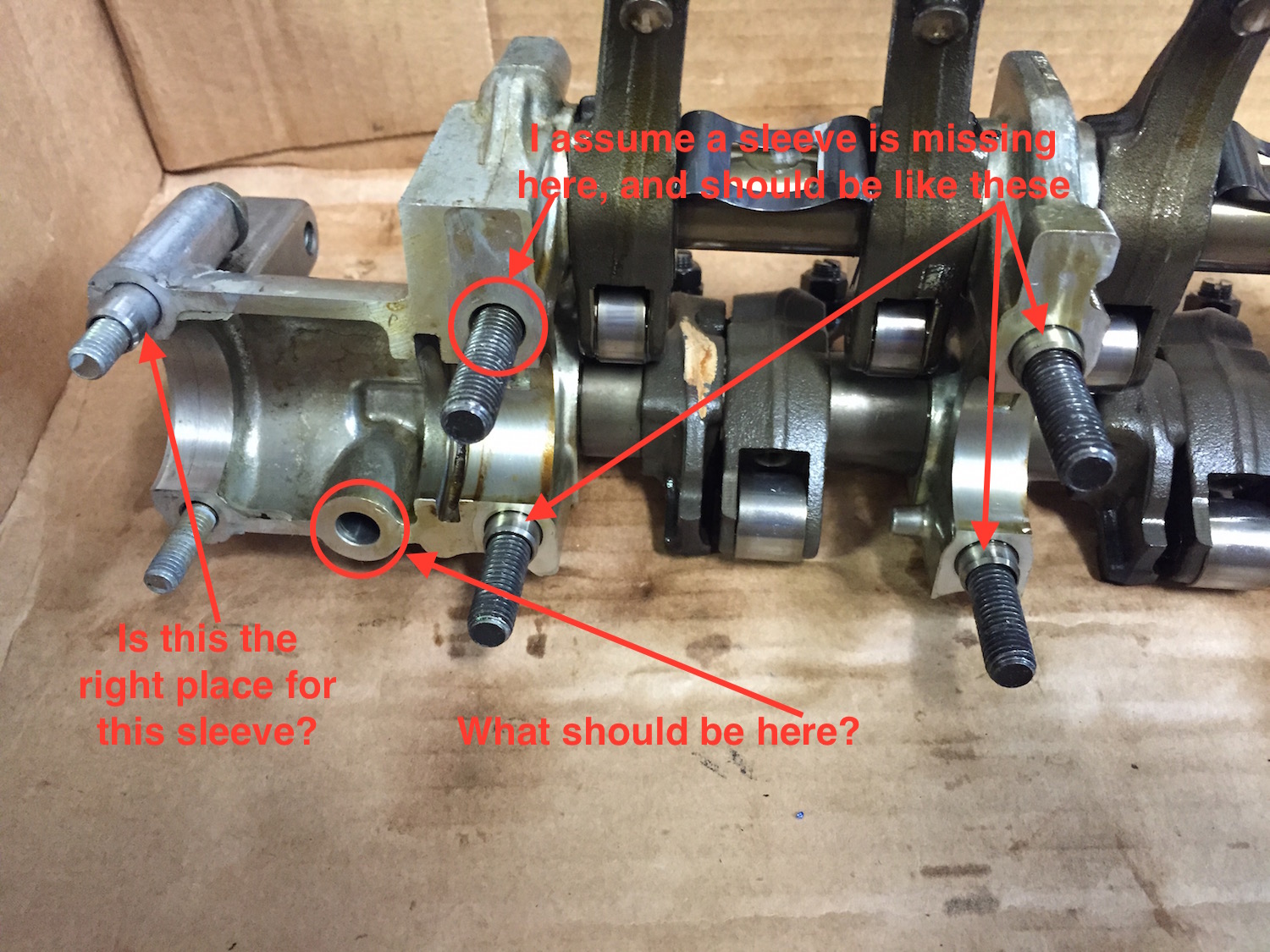 Ok, disregard the previous post. I obviously wasn't thinking / looking hard enough. I get it now that each of the bolts that attaches the rocker arm assembly to the head seems to have a sleeve / guide. In the attached picture, it looks like all but one of them is there. I assume this one is lost, since it isn't there. Perhaps when I brought the head into the machine shop, a couple of them were still stuck in the head. Stupid me. Anyway, in the attached picture, I see possibly two missing pieces, a sleeve for the bolt that doesn't have one, but what goes in the other hole that is circled?