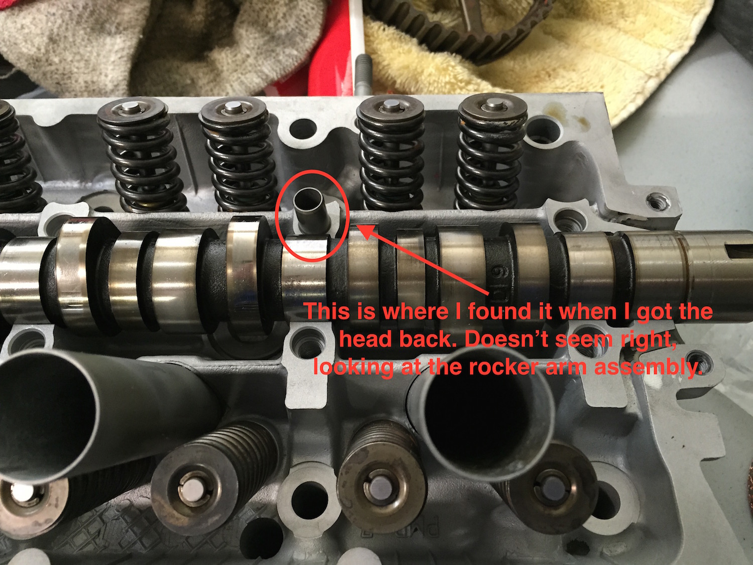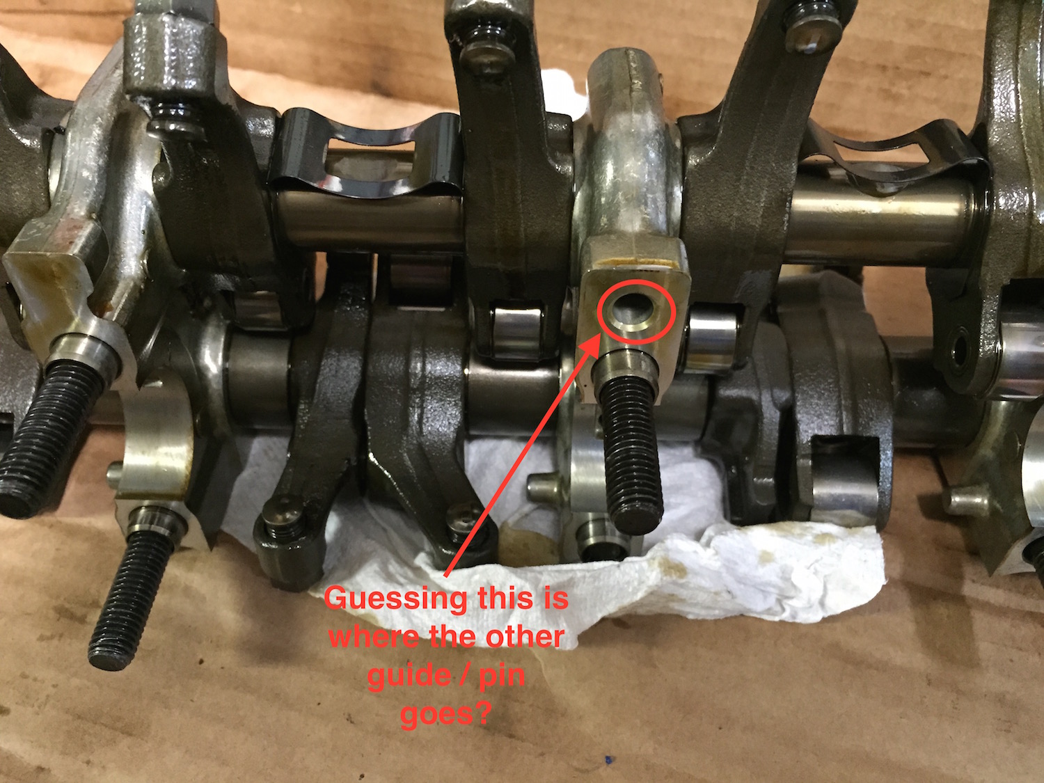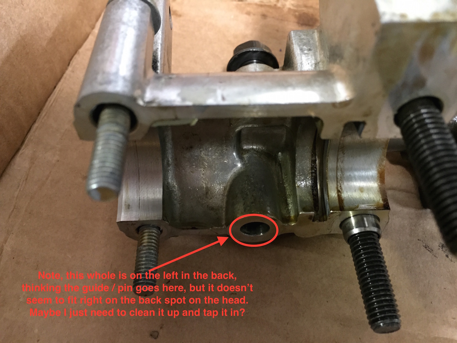 My first step is to get the cam shaft and rocker arm assembly all back together, but I am already confused. when I got the head back from the shop, they had a couple of pins in the top of the head that I think are in the wrong places. Hoping you guys can help me figure things out.