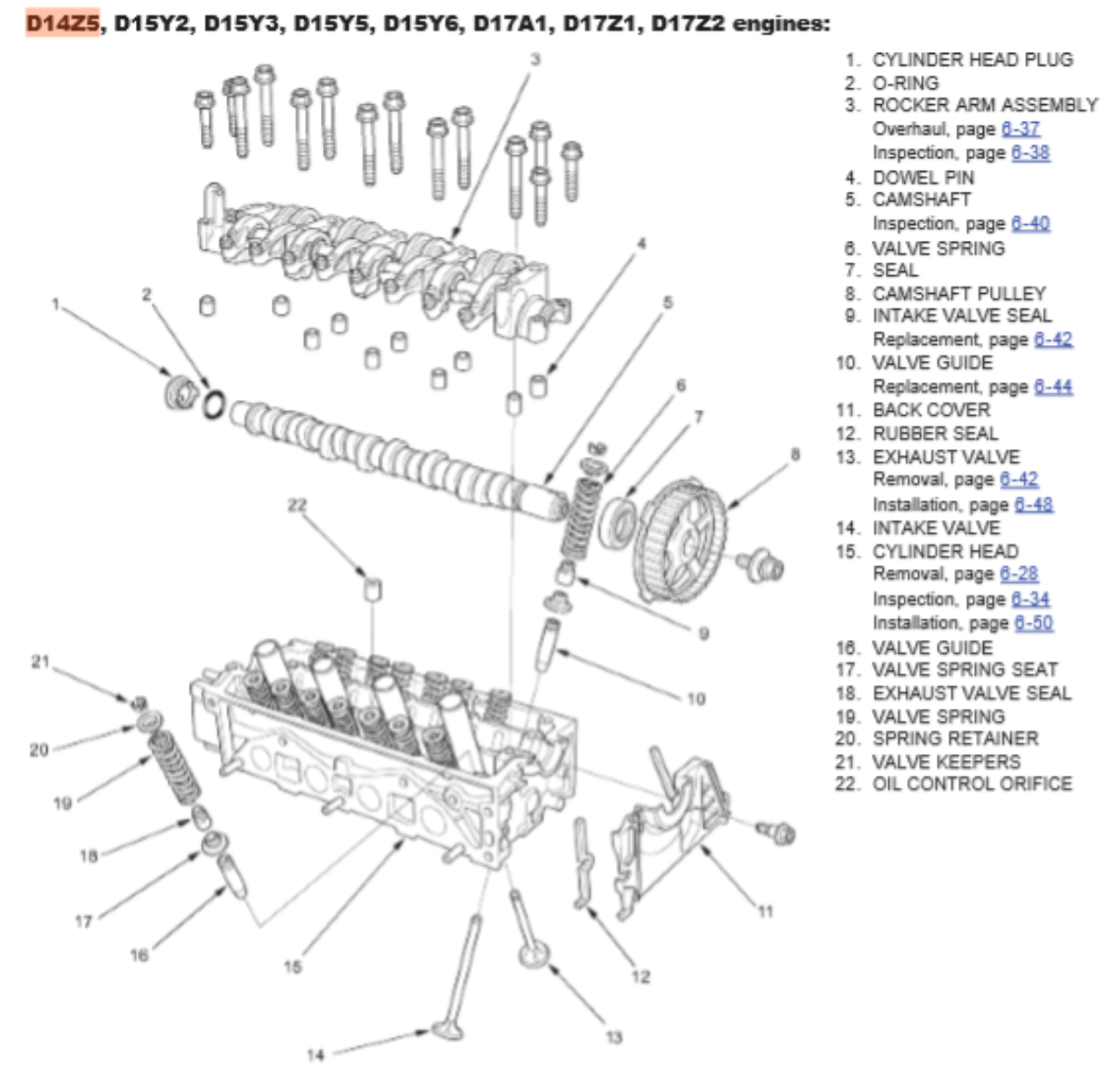 Ok, the exploded view of the rocker arm and camshaft I included before was the wrong engine. Attached is the d17a2. Which further confuses me because the bolt sleeve (journal?) on the far far left that is a little smaller than the rest is not in that picture. Not sure if it goes there like I have it in mine.