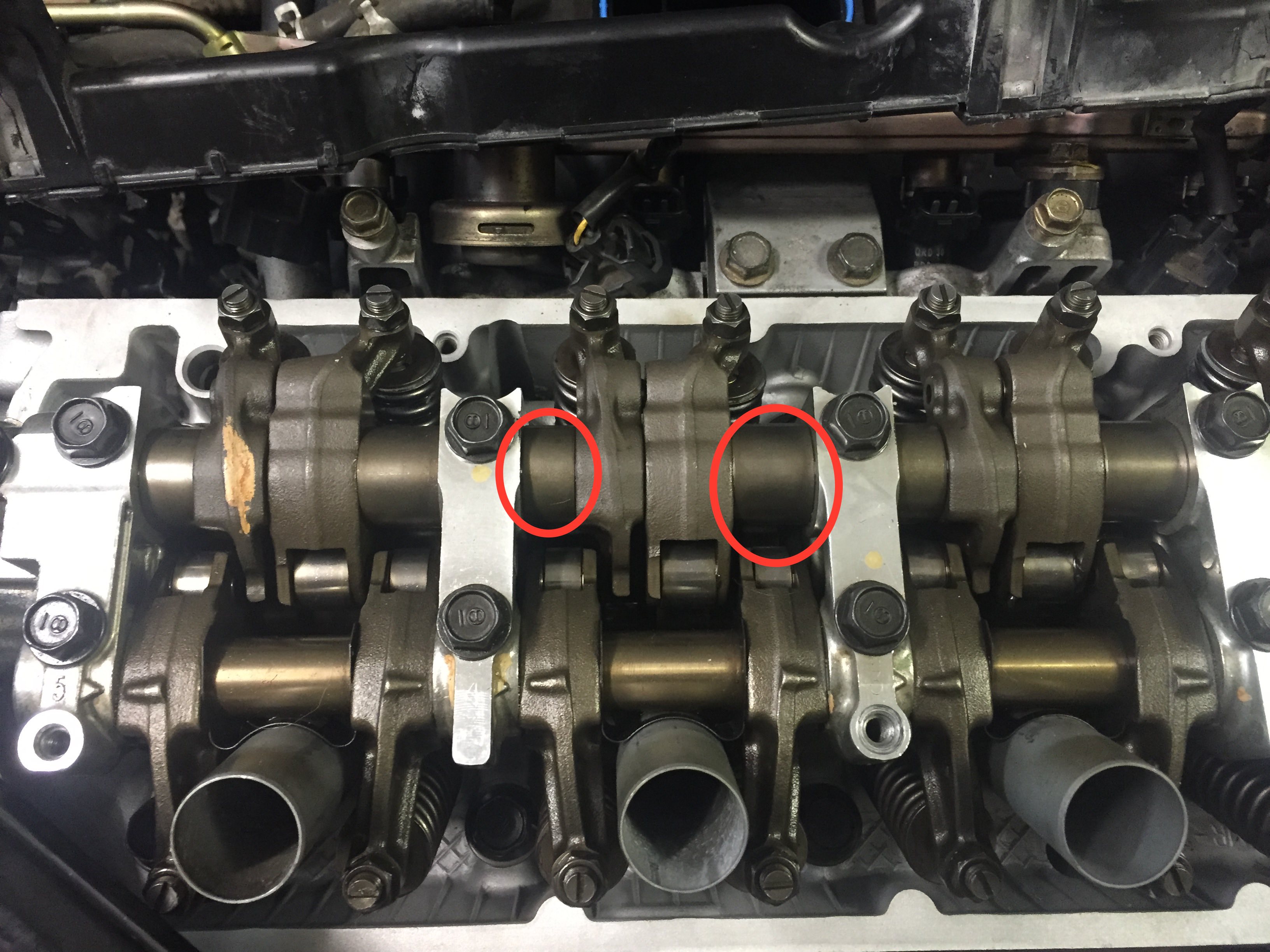 2) A couple of the cam journals (at least I think that is what they are) are not freely rotating like the rest of them. You can see the two in question in attached picture circled in red. Not sure if this is supposed to be this way or not. Do I need to take the whole rocker arm assembly off again and start this part over?