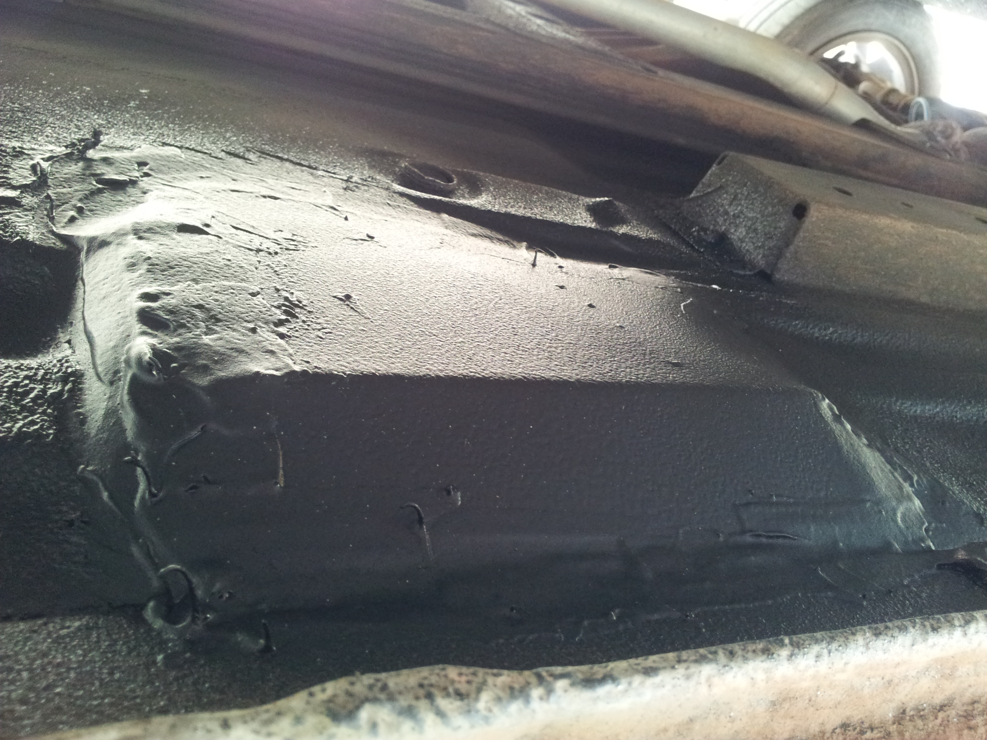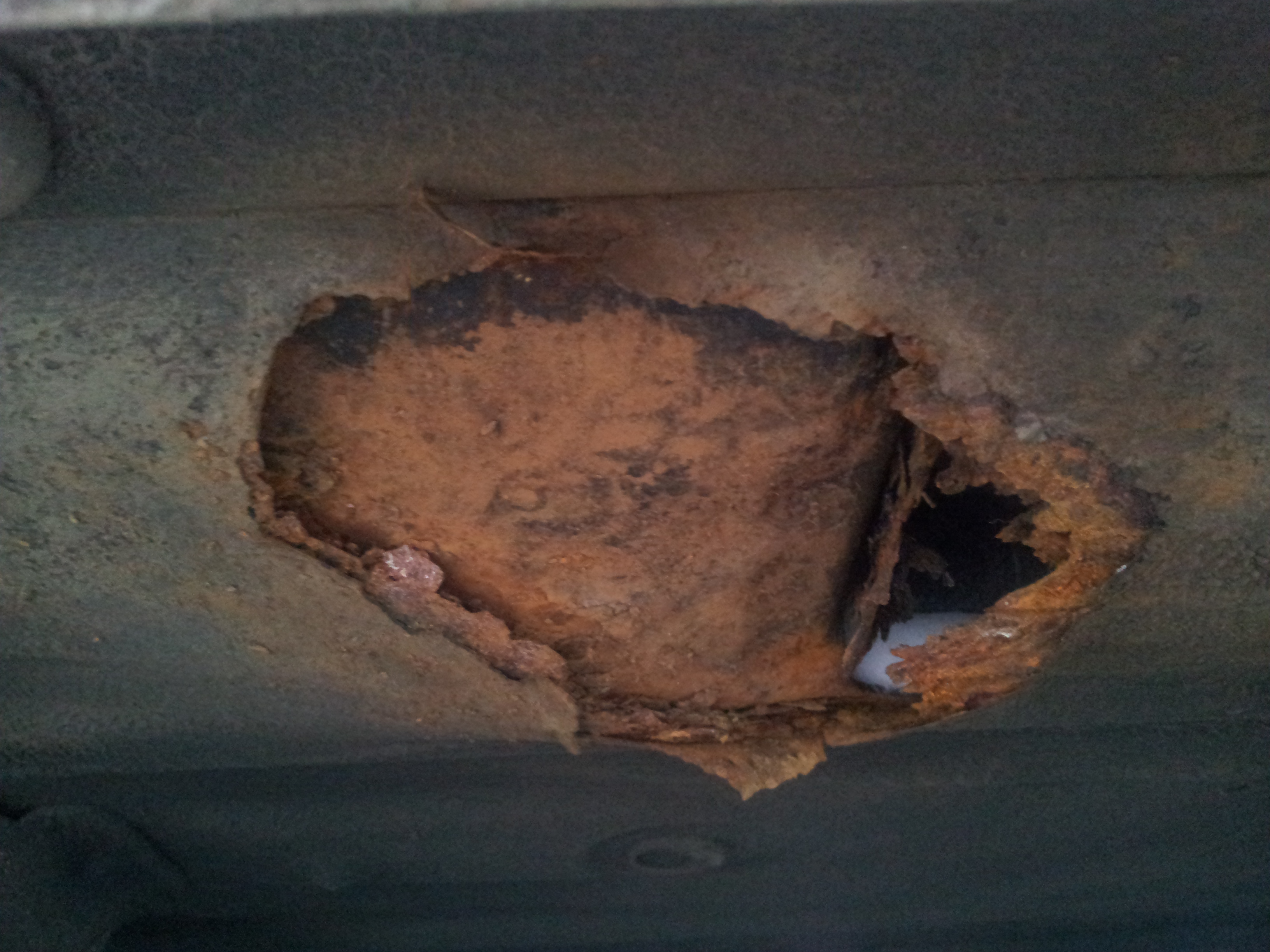 I think this is a result of the original owner getting the spray on permanent rust coating that is black and hardens. Over time if you get a crack or tear in this you will get sand and **** in there and it just rots. I could pull some of this material away from the hole and there was sand, crud and rusted metal packed under there.
