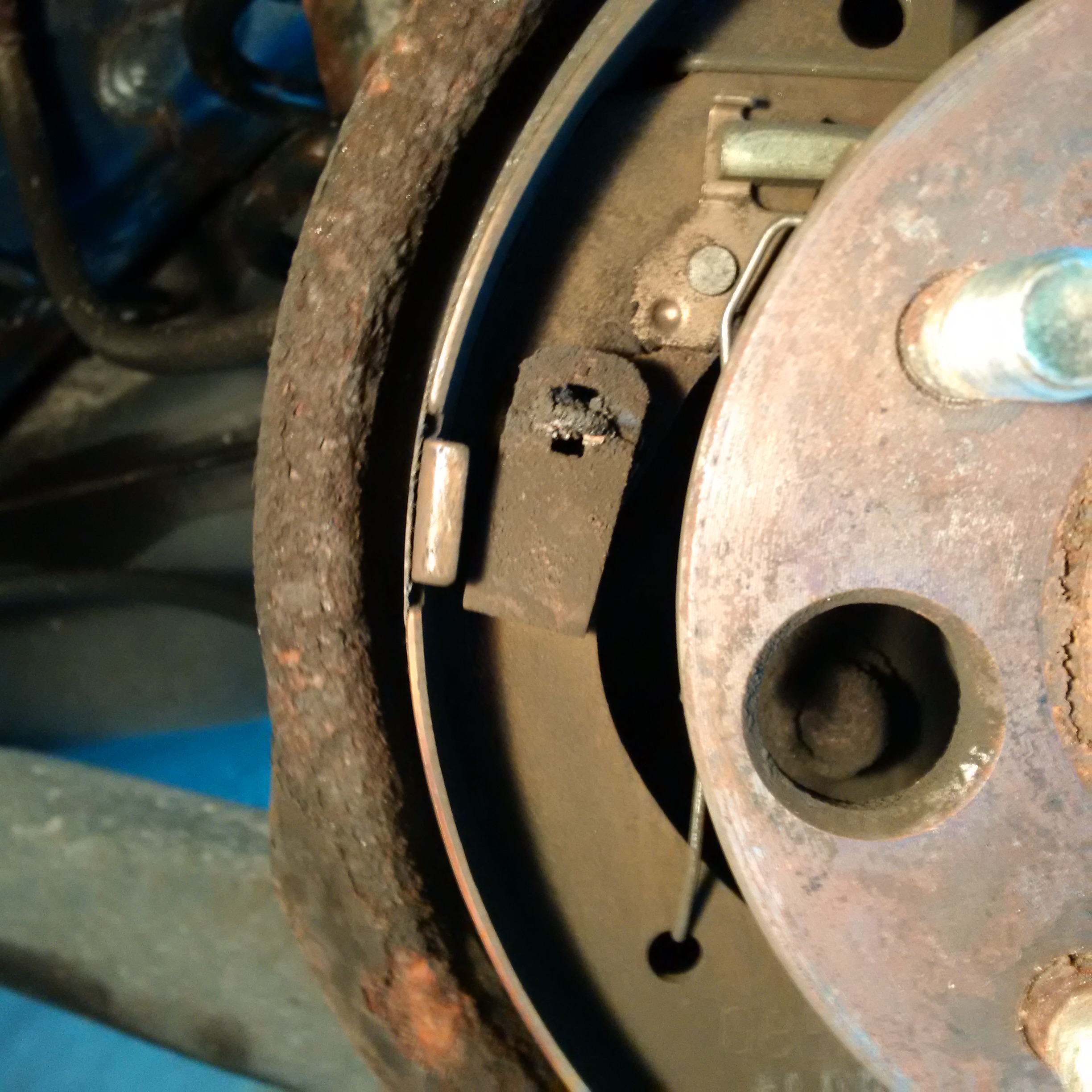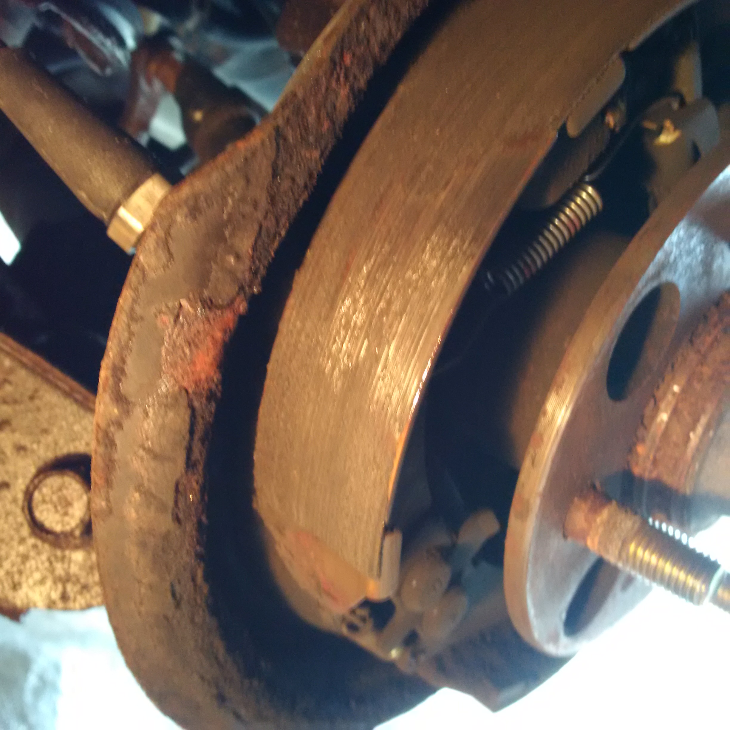 I plan to remove drum, spray internals with brake cleaner, measure shoe pad thickness and take pics, use brass brush on rusted areas of drum, lithium grease backing plate areas and inspect for wheel cylinder leakage.