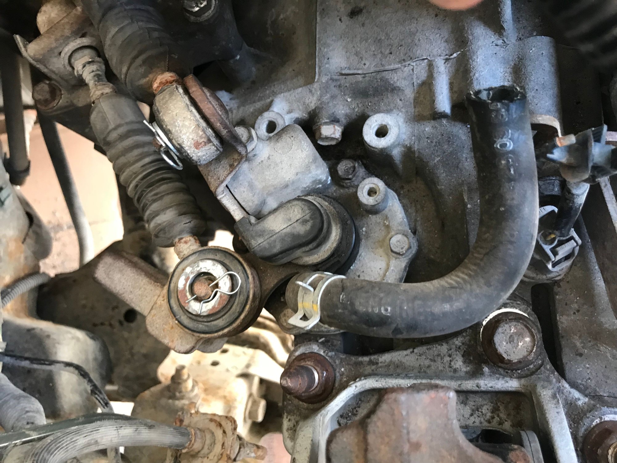 On top of the transmission, where the shift cables are connected, there is a tube. I had a piece of cut tubing on it (I didn't cut it), and I don't even know if it's supposed to be there, or where it's meant to be. I took a look at a lot of wrecked Civics at a couple of nearby scrapyards (as well as the old Hayne's manual), and I can't find anything that's a match.