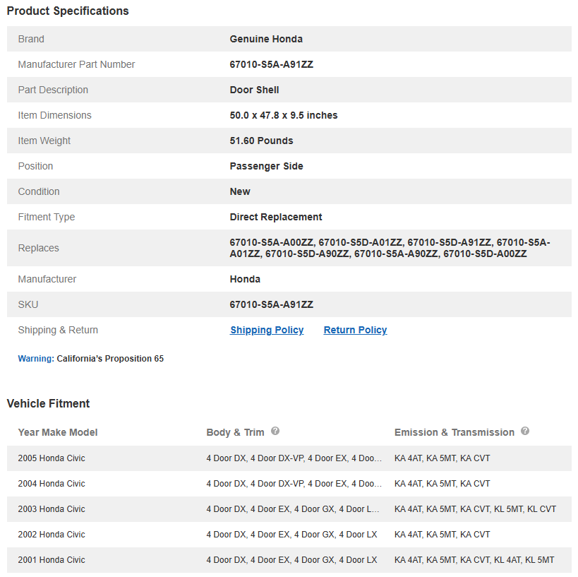 I'm looking for a replacement rear left door for my 2003 Civic VIN 2HGES25773H501406. I found a comparable door on a 2002 Civic VIN 1HGES25712L007317. Is there any way to verify that these are interchangeable?