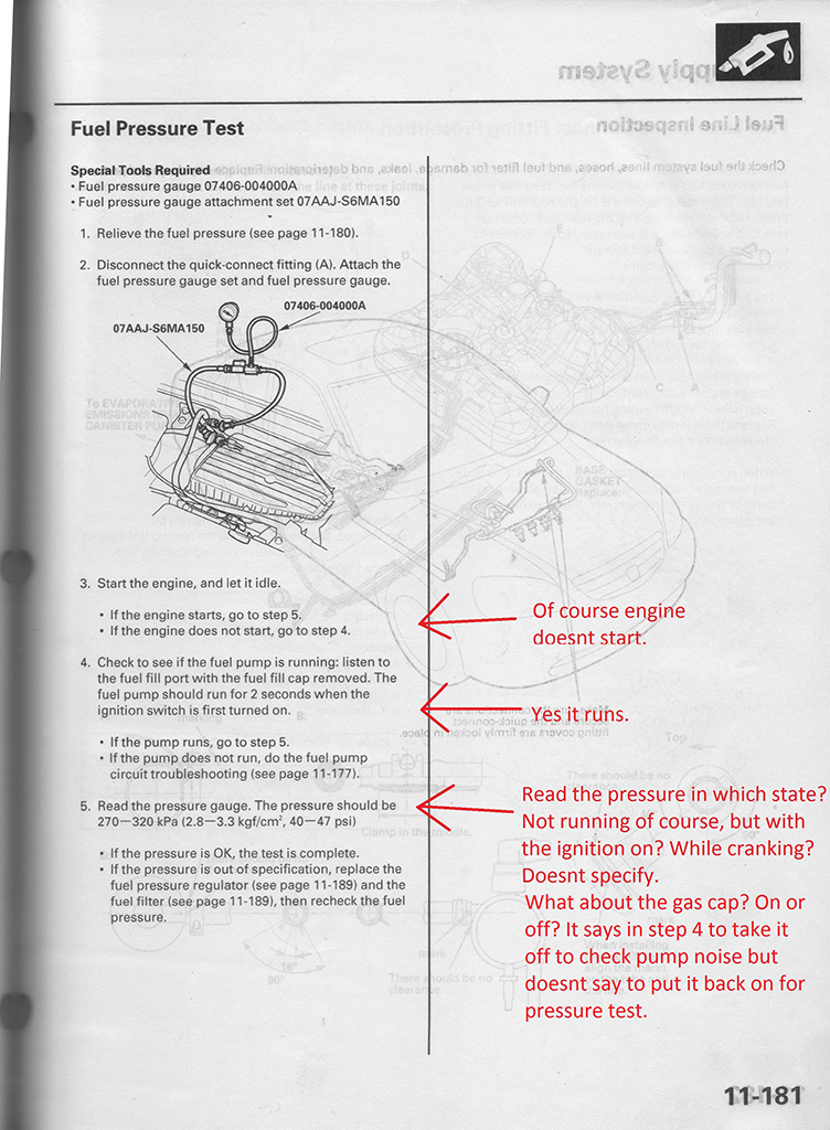 Check the picture I posted from my Honda service manual. If the pressure is to be taken with the key-on then the fuel pump it out of spec. If pressure is to be taken while cranking but not running then the fuel pump is within spec.