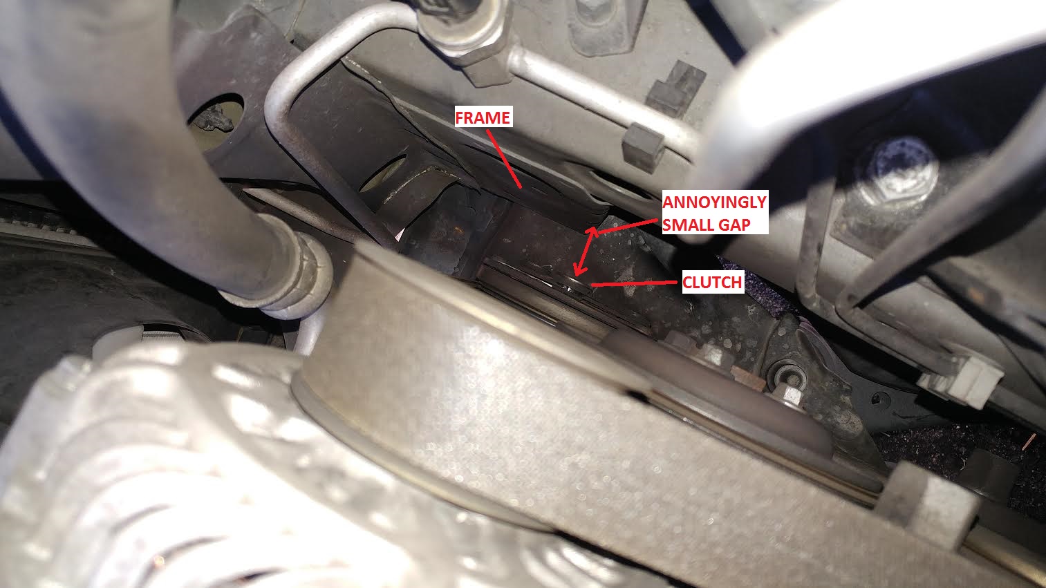 Obviously I'd like to reduce that gap. I thought I could just go into the engine bay, undo a bolt, remove the clutch plate, and go from there. However, there's a piece of the frame directly in front of the bolt head, which is preventing me from getting a socket wrench in there. I took a picture and used some amazing MS paint skills to illustrate what I'm talking about (see attached).