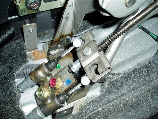 Next go into the car and remove the console. Disconnect the e-brake cables from the handle. You'll need to rotate the carrier until the wire comes up out of the slot on the side, then the pin will come out the top. Unbolt the 3 bolts that hold the cable to the underside of the car.