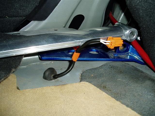 Then you'll need to remove the wheel sensor wires. On the right side, the plug is in the trunk. Pull up the carpet, you'll see a silver cover on the right side, just behind the seats. Pry it up to reveal the connector, unplug it and push it through the hole in the floor. There's also a bracket that holds it under the car, and one that holds it to the UCA. It also helps to undo the bolt that holds the muffler guard in place so you can see what you're doing when you go to put the new one in. Its the guard bolt right next to the sensor bracket. On the left, the harness is above the gas filler neck. Its a tight squeeze, but you can grab it.