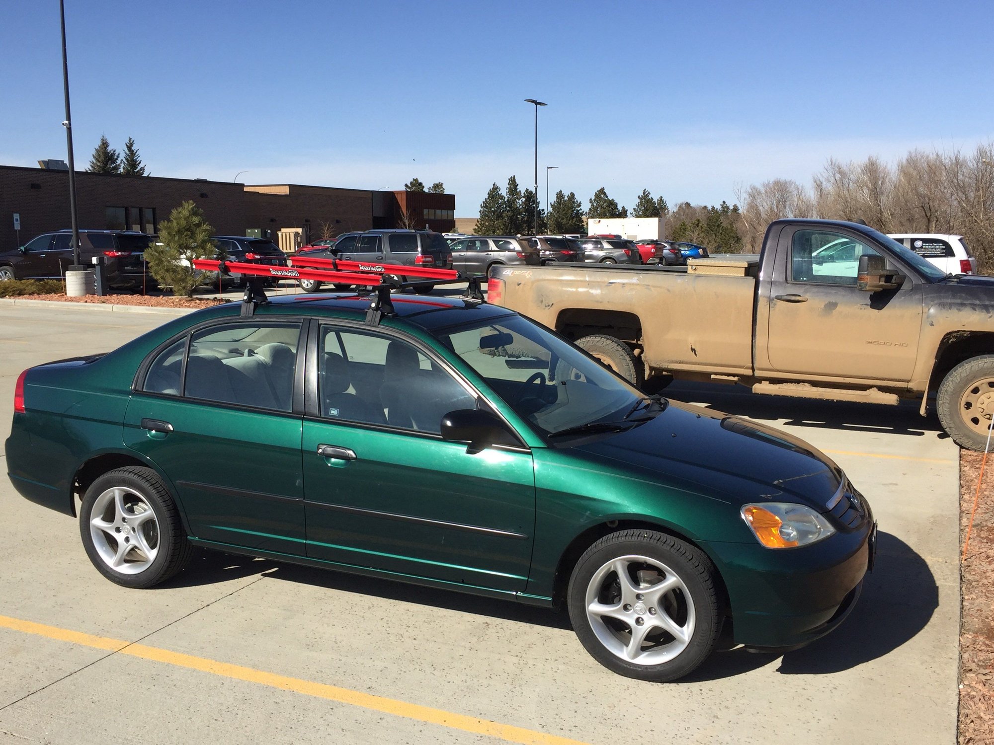 A couple more pictures now that the weather has turned nicer. I prepped and painted with silver POR 15 the brake drums and front hubs as they were pretty corroded. Painted the calipers black, also POR 15. The looks of these Miata wheels has really grown on me. They seem to suit the car as they are from the same era of Miata (2002) as this Civic. I also put the bike rack back on that the car came with.