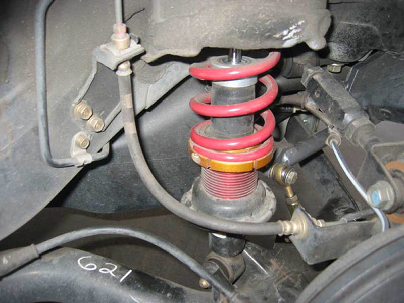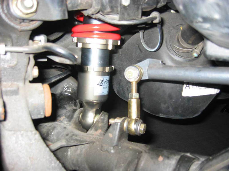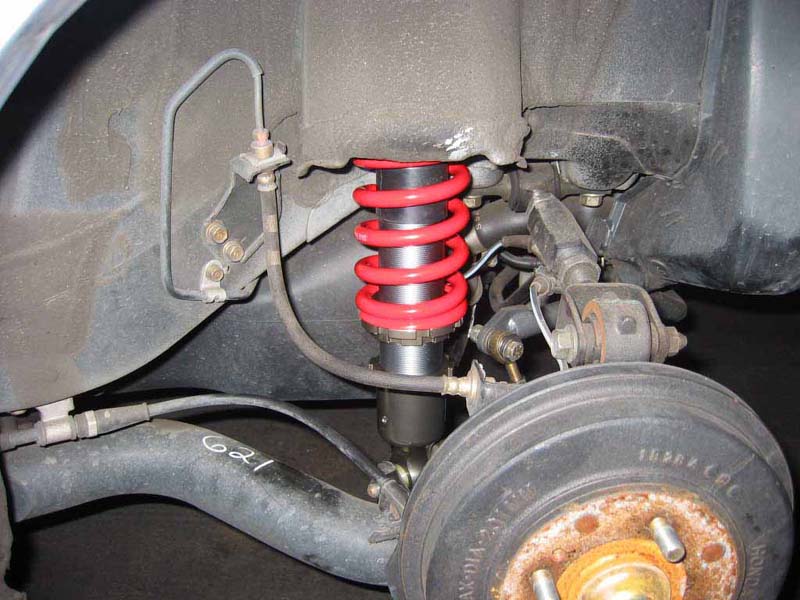 after you unbolt those, go back out under the car, and push the stock strut out and wedge the whole assembly off, and wedge the hayame assembly in the stock position. I pretuned the hayame's before I put them in so they would all be at the same height. you can do it for what ever ride heigt you like.
