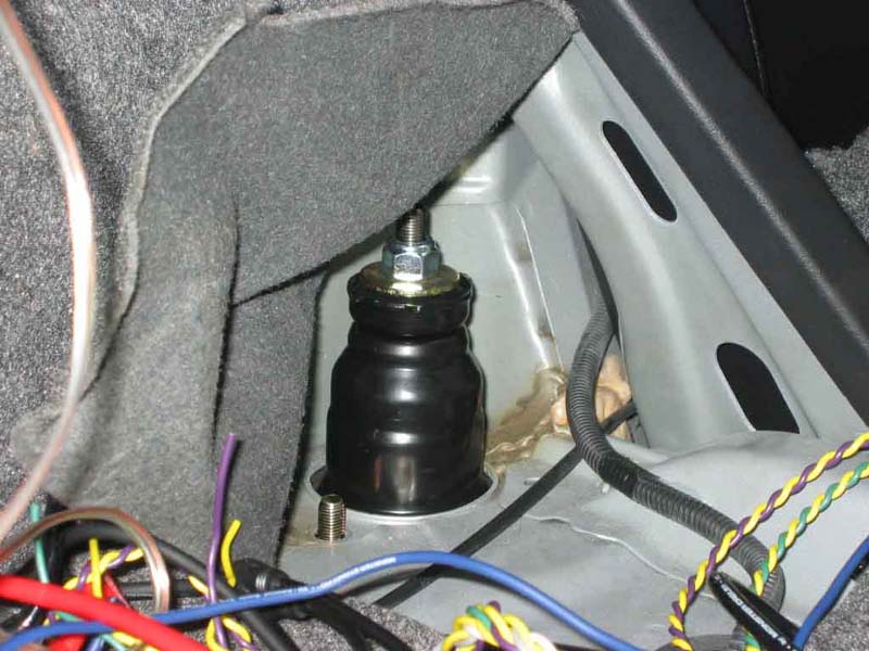 Ok, now you go into your trunk, scoot your rear seats in, and pull up the corner carpeting to expose the strut mounting points. Unbolt the 2 bolts with a 14 mm deep socket with wrench, these were a b*tch for me when i didn't have the deep socket head, the shallow one won't work cause the bolt is too long for it