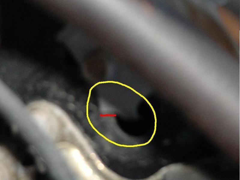 Okay... if look on the blurry piture. The yellow area I circled is the bottom of that braket that held the clutch resivor in place. The braket is held in place by a screw. Now anything that is held by a single point like a screw can rotate around, so what keeps from rotating is a tab on the bottom of the bracket that goes into a hole in the fender well area (that is what I circled in yellow). I simply grinded the tab down to half of it's orginal length so that the whole system could rotate a little bit. When I put the bar on, I simply rotated it forward and put he front bar on (I had my girl friend hold the resivor forward while I hit the bar). The red line on the second picture is the amount I cut off. If you look closely you'll see the bottom of the bracket is beyond the edge of that hole in the fender, that is the area I cut off.
