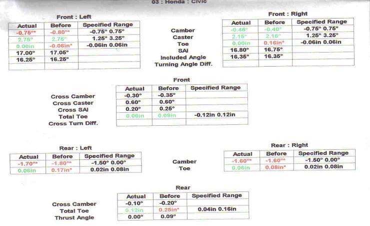 i also do alignments. the way that your printout looks, it seems they adjusted toe on front and rear. and it looks like they used a hunter machine. the machine tells the tech that there isnt any rear camber so they probobly didnt bother to look and just did you toe. i can do a civic with front and rear camber kits in about 30 min if everything moves easily.