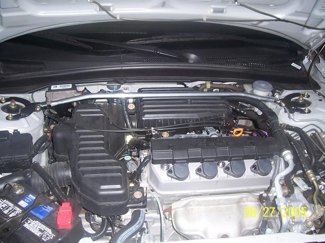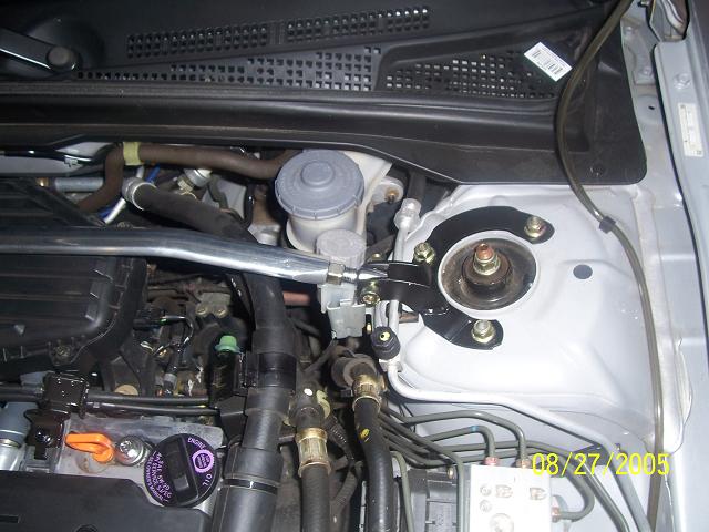 ok, here are the strut bar pics installed, the second one shows my resevior stuck between the strut bar and the brake resevior. it don't move so its ok. thanx for the help again.