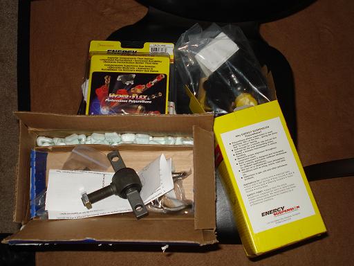 I called around and found a kewl person thats working on it for pretty cheap,he's gonna install my energy motor mount inserts,russell stainless brakelines,brembo replacement rotor for fronts, front and rear brake pads,front and rear energy control arm bushings sets,and 4 shocks for 400 dollars without an alighnment,that seemed like a pretty good price? well anyways i'm picking my car up tuesday at noon so i'll let u guys know.