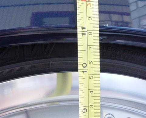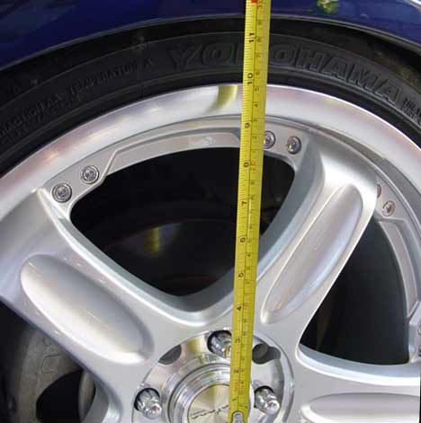 3. Simply measure the distance from the CENTER hub of your wheel to the top of the fender lip. In the front, it should be in between the plastic moulding and the fender while the rear is the edge of the fender lip, NOT where the lip bends. If your rear fender lip is shaved to accomidate more space I'll post how much of an inch needs to be added. (It shouldn't be that much.)