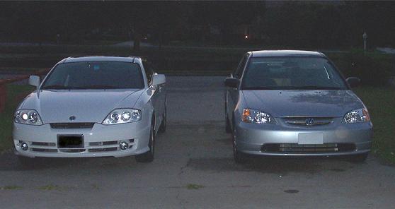 Let me see if I can answer all the questions in order. First off, you don't want a picture of my sister, trust me. I have been a member of newtiburon.com for quite sometime. I did not get anything for the misquoted hp crap because I bought my car after they had announced it, so I got nothing. Finally, the headlights are DIY, very similar to the DIY headlights for the civic. Well actually, it's easier for thr Tiburon.