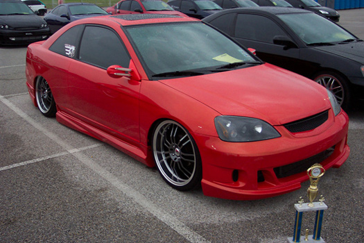 The red/orange one is mine. I should have pics up later tonight of everything that I've done. The paint is actually red/orange with a ton of gold pearl in it. It didn't come out too good b/c it was cloudy. But I took some pics earlier today, and hopefully I'll have them up later tonight.