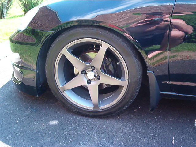 . The rim and rubber combo are 215/45/17 on Flik Titan 17 with, I think, +45 offset