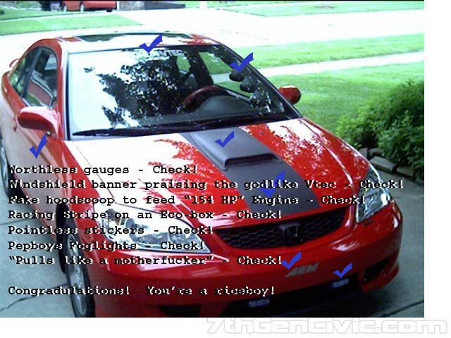 let him have his way guyz...may b he will end up in a video like that one i seen about the mustang GT-(R) doing 11's with a turbochaged rotary engine........oooooooooooweeeeeeeee...stupid...lmf ao....and dont get me wrong my car has rice on it....but my rice tastes good and many judges agree thats why i win trophies..i tryed to help him by photochopping a cf hood on his car but i guess he dont like it.....he even said he was gon make his own 7thgen sticker...now that is a true ricer man cant beat that.....i have a question for u bro????