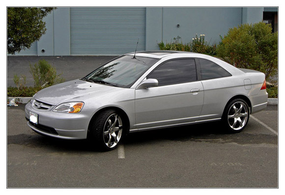 i cant help with a picture...but IMO, i wouldnt get rims w/o a drop. if your going to go with a bigger(17n up) u might b able to get away with it, but if your going with a 15-16in rim u need to drop it. i have tein S-tech (1.5 in drop about) n i have the stock 5spoke alloy from 2001 n it looks nice n clean. just my input.