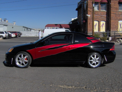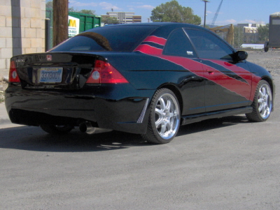 Congratulations dude, you are the FIRST and ONLY one to say rice,ricey, riced when describing my car. Where's the big wing, the dozen stickers, the cheap Kragen add-ons. FYI- those graphics are not vinyl but rather HOK paint. When you see that red candy in the sunlight against the black, wow is all I can say, nothing like it. There are some good pics in the "Black Civics" thread.