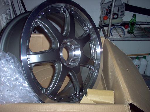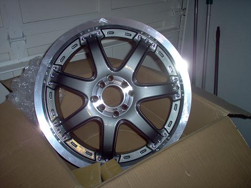 damn its been few days i got the new rims... juss didnt have time to get it on my car ... looks pretty... but today... when i was patching my tire ( there was a HUGE nail, no, needle, no, metal thing was stuck in it for like a week i knew the air is going out for something...) anyways here's the pic of my new rim ... i was trying to put the nuts in ... but it didnt go in the hole....!!!! DAMN!!!!!! the whole is smaller... i mean it goes in .. but no space to skrew in ...it ... no.. doesnt fit!!! $H!* ....