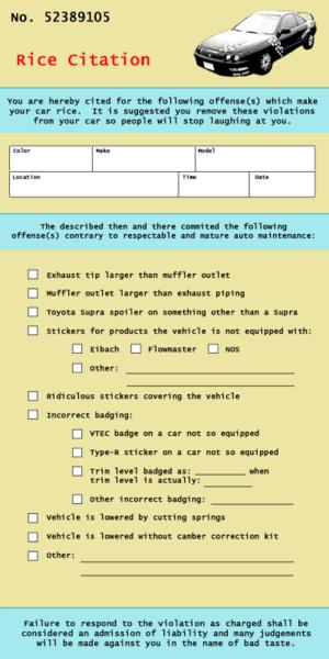 but ****... fron kansas.. well then... ive been motivated to take pics of ricers daily... im gonna try to print out that ricer ticket... have a couple in my whip and issue them to parked ricers lol... i see a little too many SUPRA wings and Type R emblems on green integras...