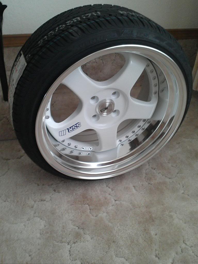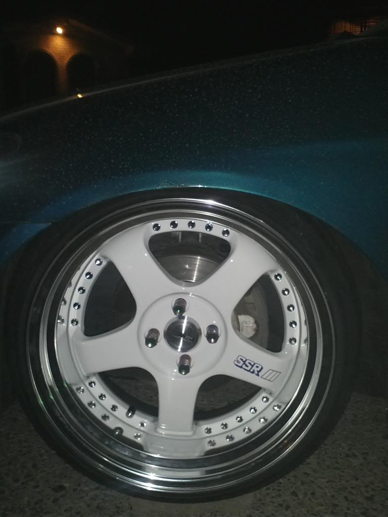 Here are the new wheels (SSR Professor SP1 17x9.5 +18 and 17x10.5 +18)... got the fronts fitted perfectly and the rears I used a 25mm spacer (didn't like the extreme poke and camber) so I am dropping to a 15mm spacer and running less camber. The tranny gave out when I was test driving after the rims so its at the shop right now getting a new tranny. Hopefully have it back it two weeks to get it ready for a show. More pics coming within the month.