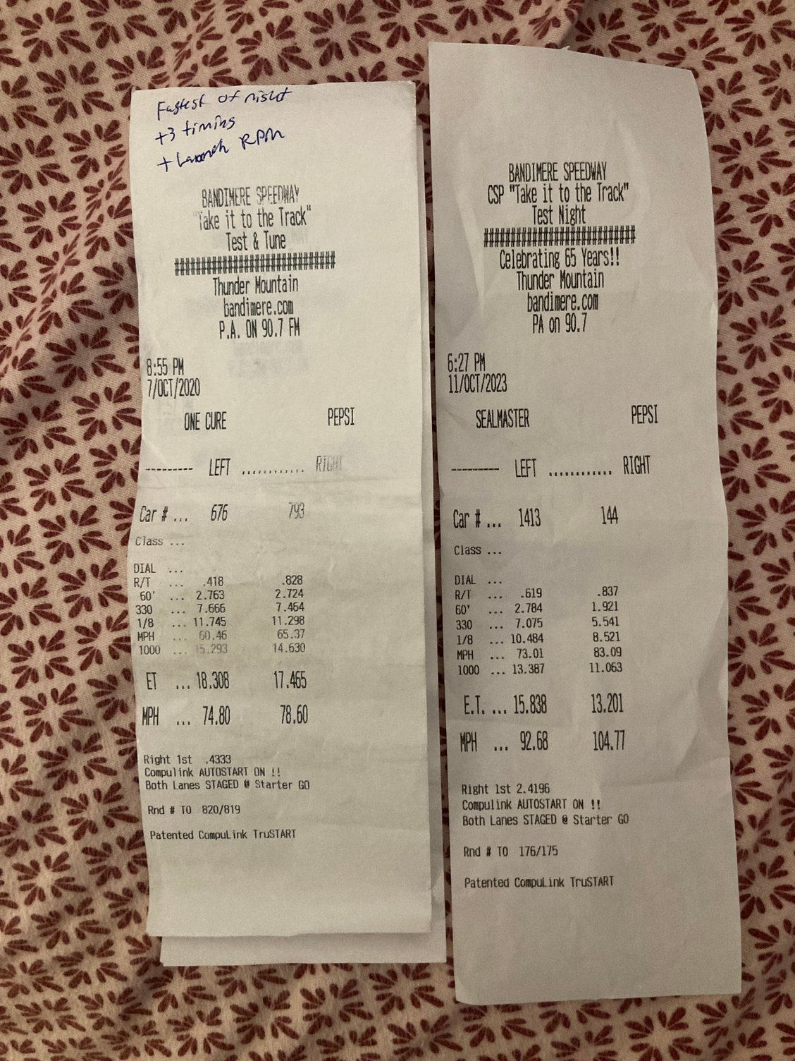 Ok so quick update, I made it to the local track for the last test and tune before they tear the track down. Unfortunately I only got one pass before the rain rolled in and they called it. But that’s the bad news. Good news is on 5.5 pounds of boost and no adjustments to timing tables I ran the quarter shy of 3 seconds faster than when the car was N/A. Not “fast” by any means, but it’s a starting point. I’m left lane on both.
