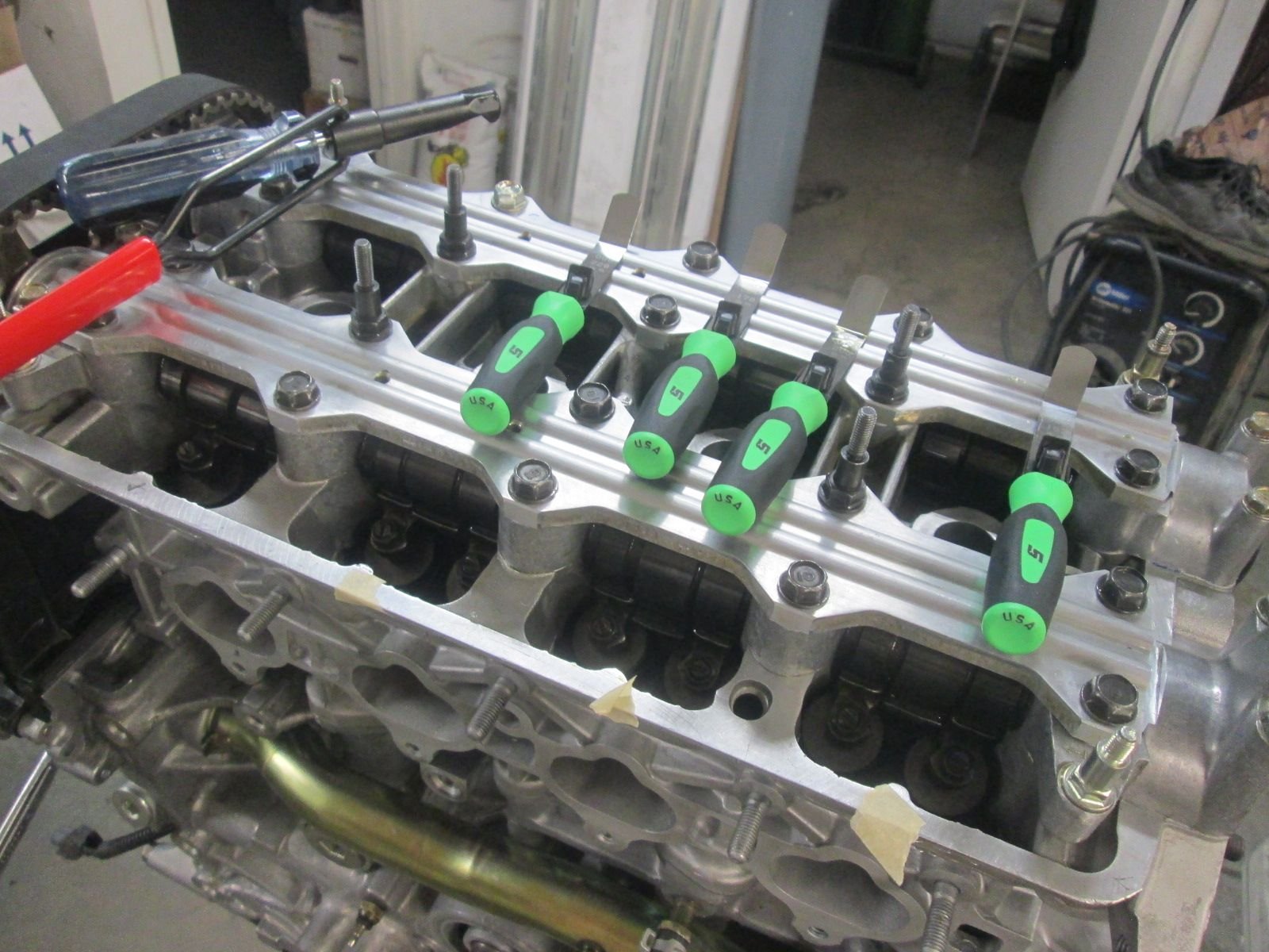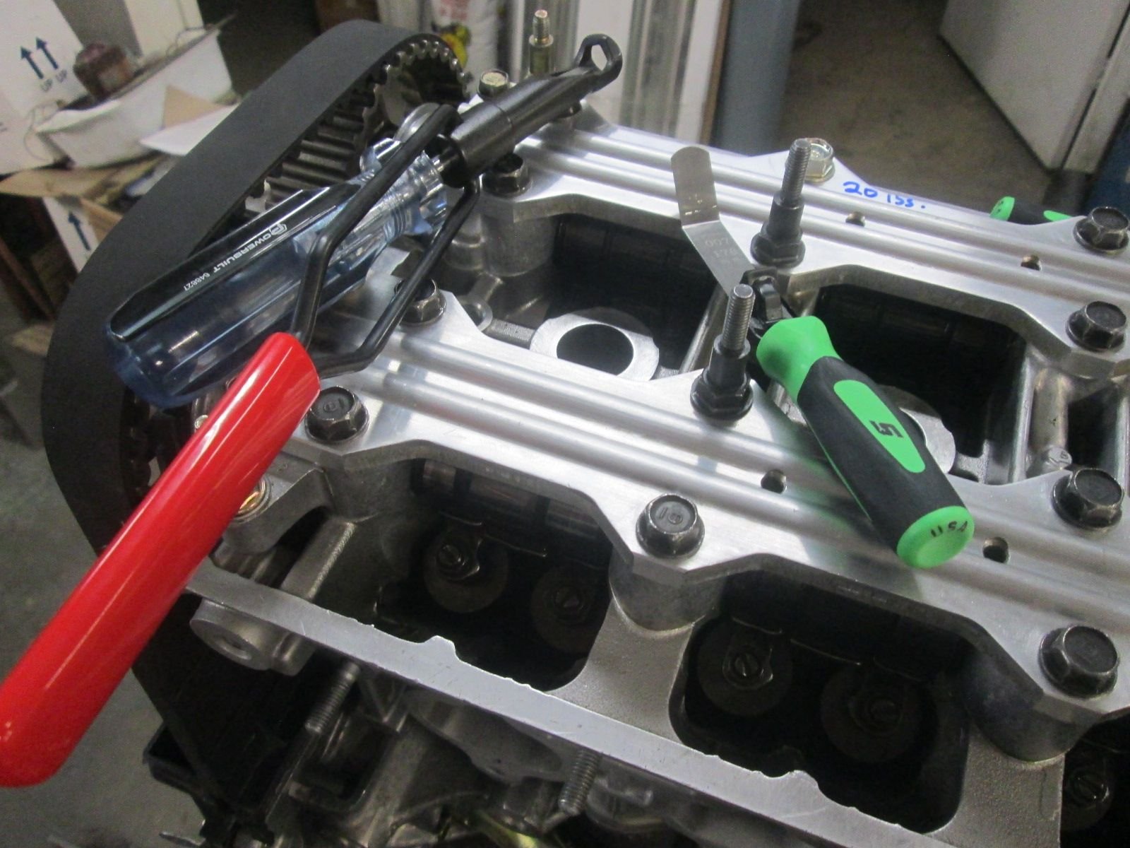Bought a new set of feeler gauges and the specialized adjustment and tightening tool. Rolled the cams over to the base circle and set the Intakes at 7 thousandths and the Exhausts to 8 thousandths as recommended in the assembly video.