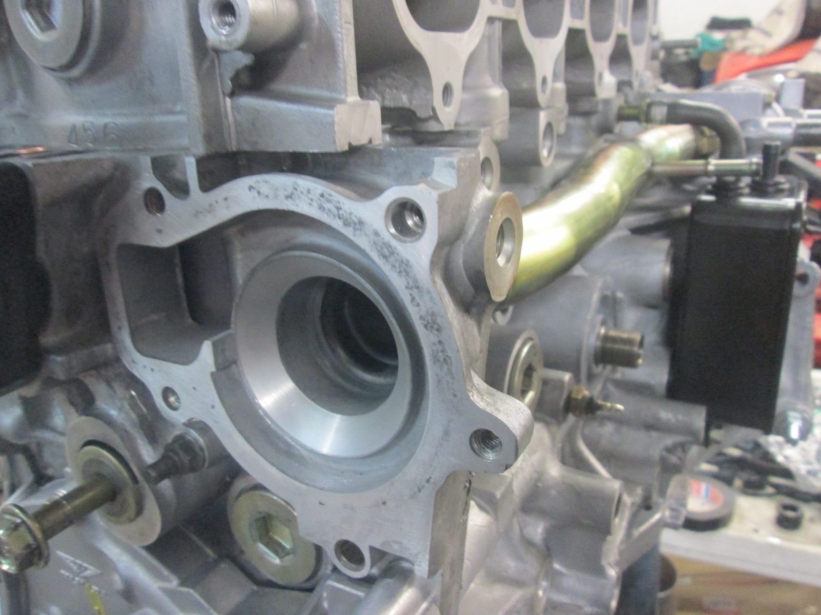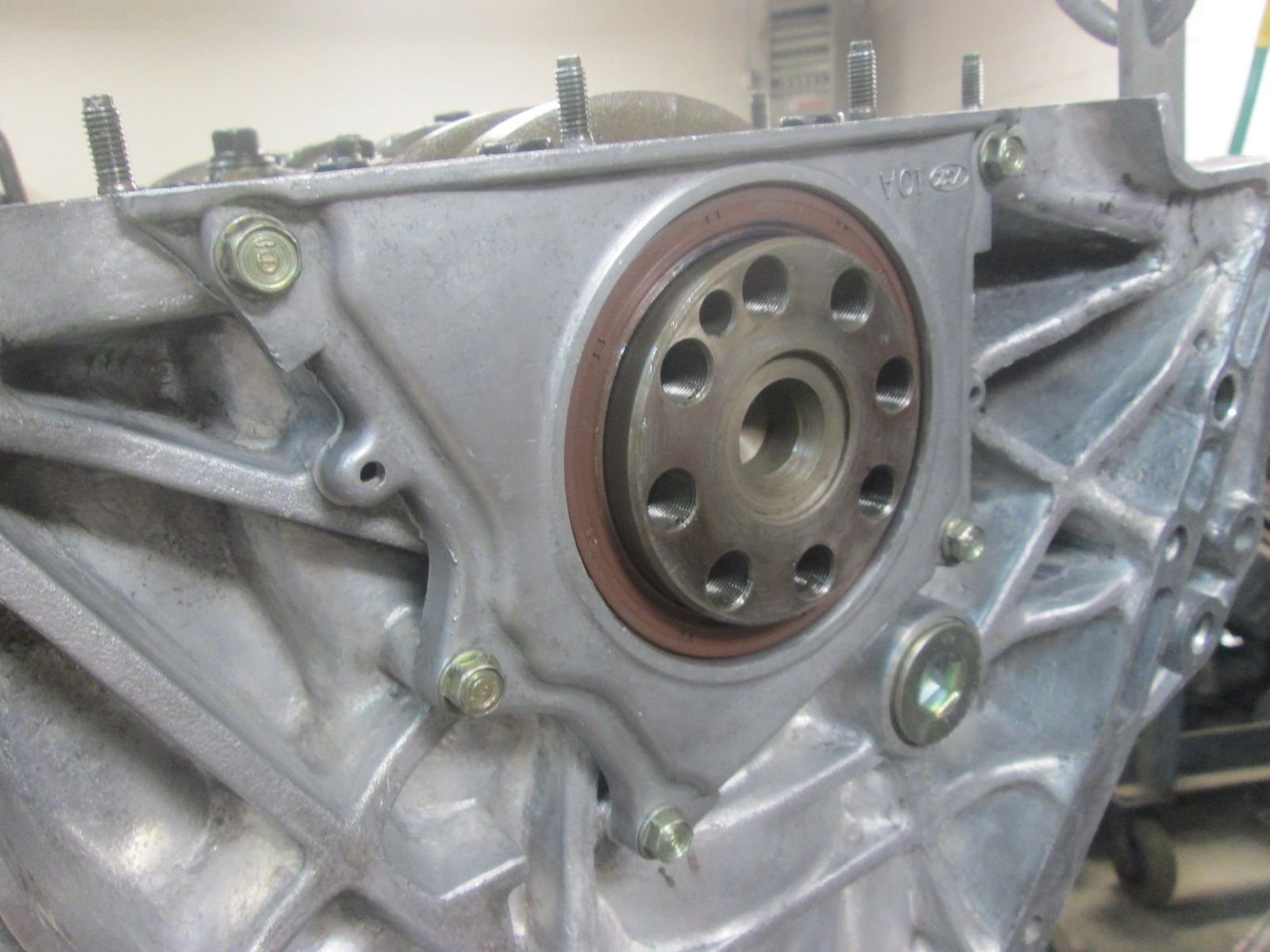 Motor off the stand and fly wheel installed with new OEM pilot bearing with bolts torqued to spec here. Even the pilot bearing that they installed was garbage as it didn't spin smoothly. Again my machinist recommend no resurfacing at this time.