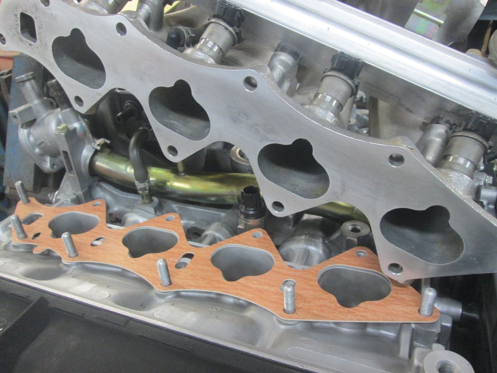 Knock sensor installed and intake manifold ready to remount. After all those miles a very thick layer of carbon and deposits built up around the injector heads and completely lined the intake runners and the rest of the inside of the manifold. It took several rounds to finally get the inside of this unit clean. This one of those chores you'll only do yourself. The dealer just put it right back on all gummed up and hastily removed the old gasket remains with a roloc wheel. I had to hand block the flange to eliminate the grinding marks and clean the surface up as best as I could but some surface scars remain. It should seal up fine though.