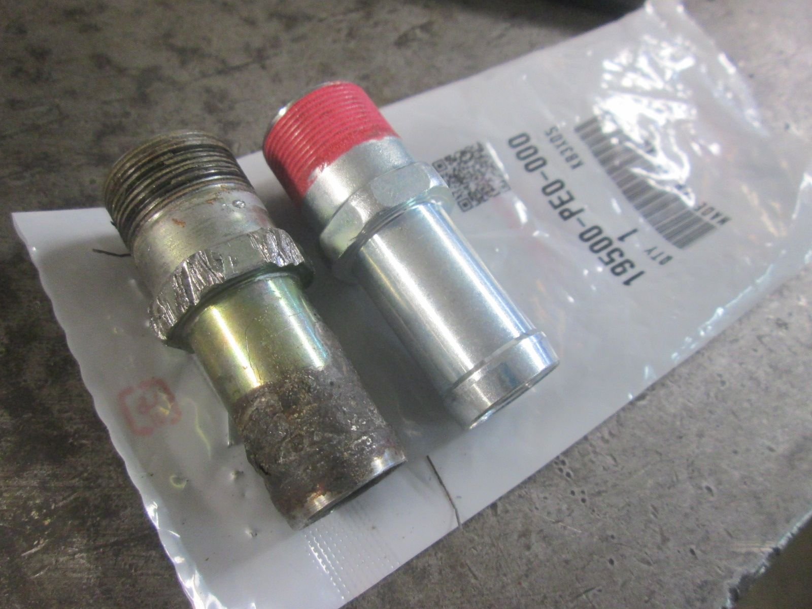 Coolant tube and crankcase breather with new grommets installed next. Some corrosion on the hose fitting on the thermostat housing but nothing serious. I would have replaced it but it's another discontinued part.